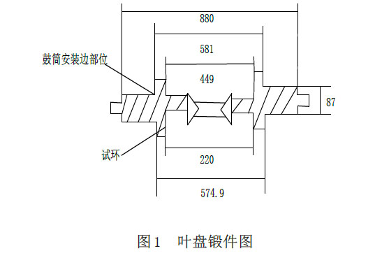如圖1所示,整個葉盤鍛件由試環和鼓筒安裝邊部位組成。